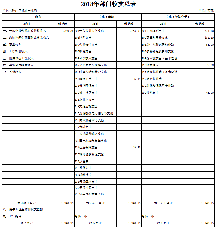 2018年部门预算总收入1,340.35万元,较2017年年初预算增加951.29万元,增长244.51%。其中:一般公共预算财政拨款(补助)收入1,340.35万元。