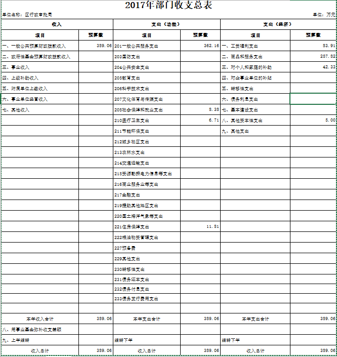 2017年部门预算总收入389.06万元。较2016年年初预算减少33.58万元,减少7.95%。其中:财政拨款(补助)收入389.06万元。