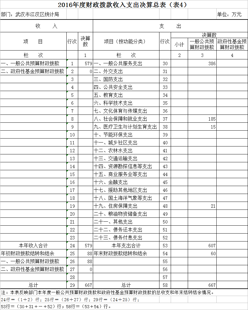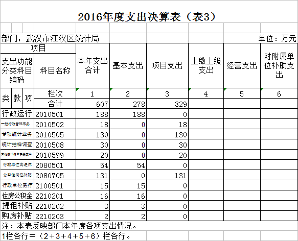 2016年度收入总计 579 万元,支出总计 607万元。与2015年相比,收入增加73万元 ,增长14.43%,主要原因是2016年新增10名统计协理员和3名统计调查员。支出增加124万元,增长25.67%,主要原因是新增10名统计协理员和3名统计调查员。