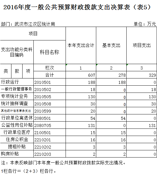 2016年一般公共预算财政拨款支出年度预算为607万元(包括年初部门预算、基本建设等专项资金、上级下达的专项转移支付资金及年初结转和结余资金等支出),支出决算为 607万元,完成年度预算100 %。其中:基本支出 278 万元,项目支出 389万元。项目支出主要用于专项统计业务130 万元,主要成效:用于各项专项或临时性统计调查,劳动力调查、住户一体化调查等;公益性岗位补贴131万元,主要成效:统计协理员、统计调查员的工资、补贴发放,稳定了基层统计人员队伍。
