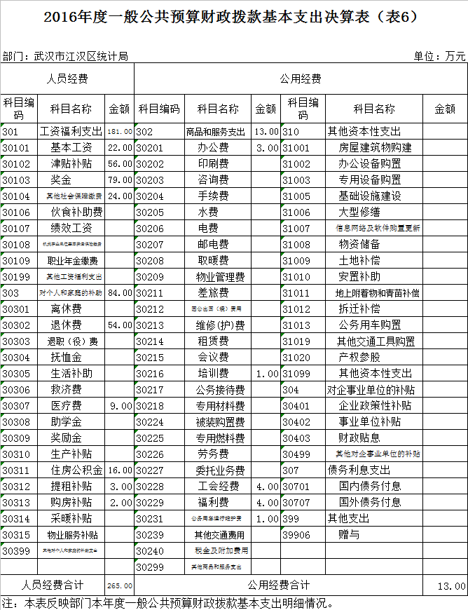 2016年度一般公共预算财政拨款基本支出278万元,其中,人员经费 265万元,主要包括:基本工资、津贴补贴、奖金、社会保障缴费、退休费、住房公积金、提租补贴、购房补贴、其他对个人和家庭的补助支出;公用经费 13 万元,主要包括:办公费、培训费、工会经费、福利费、公务用车运行维护费。