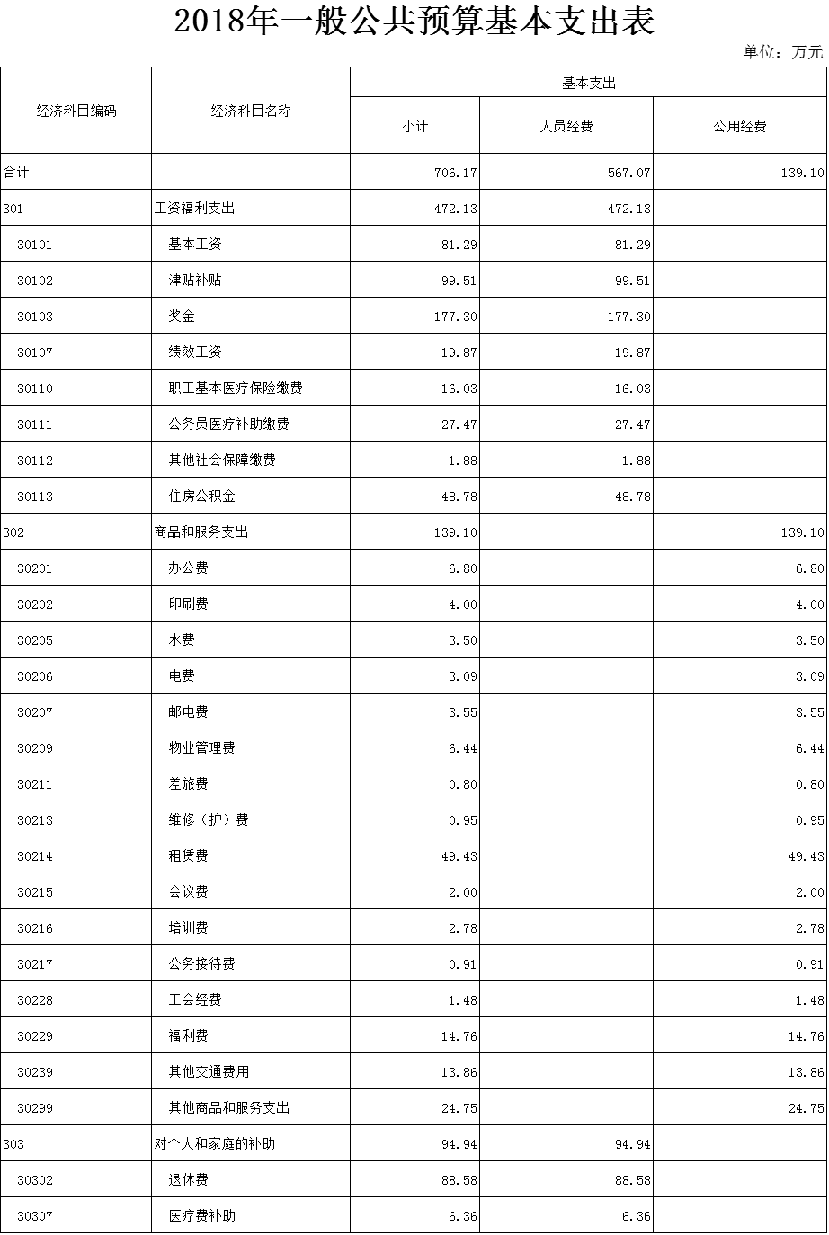 (一)基本支出706.17万元,较2017年年初预算增加74.16万元,增长11.73%,主要原因是人员经费增加。主要用于: