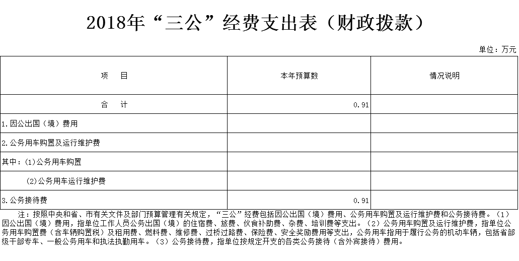 2018年部门财政拨款资金安排“三公”经费预算0.91 万元。具体情况如下:
