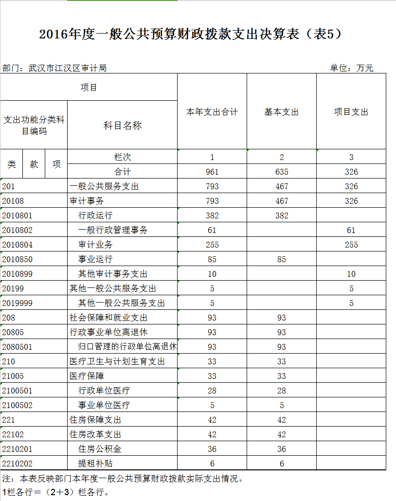 2016年一般公共预算财政拨款支出年度预算为961万元(包括年初部门预算、基本建设等专项资金、上级下达的专项转移支付资金及年初结转和结余资金等支出),支出决算为961万元,完成年度预算的100%。其中:基本支出635万元,项目支出326万元。项目支出主要用于中介机构外聘费、固投工作经费106万元,主要成效是提升了审计队伍综合实力,推进政府重点投资项目审计三位一体模式的实施;审计八不准外勤经费支出33万元,主要成效是全面贯彻落实了审计工作纪律;金审工程设备更新及网络维护费30万,主要成效是审计信息化建设水平得到提升;领导干部经济责任审计26万元,主要成效是规范了对领导干部权力运行的监督;审计培训费、审计质量控制、档案管理等其他项目支出131万元,主要用于提升审计项目质量和审计业务运转。
