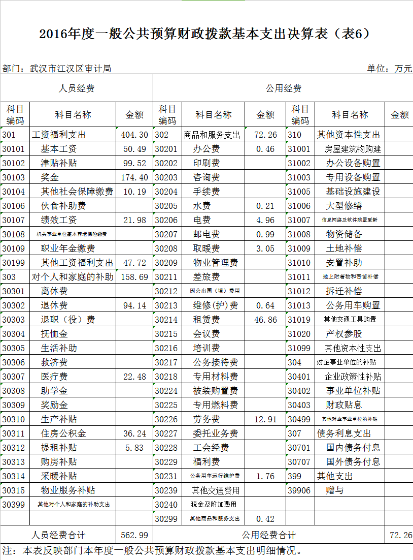 2016年度一般公共预算财政拨款基本支出635万元,其中,人员经费563万元,主要包括:基本工资、津贴补贴、奖金、社会保障缴费、绩效工资、其他工资福利支出、离休费、退休费、抚恤金、退职(役)费、抚恤金、生活补助、救济费、医疗费、助学金、奖励金、生产补贴、住房公积金、提租补贴、购房补贴、其他对个人和家庭的补助支出;公用经费72万元,主要包括:办公费、印刷费、咨询费、手续费、水费、电费、邮电费、取暖费、物业管理费、差旅费、因公出国(境)费、维修(护)费、租赁费、会议费、培训费、公务接待费、专用材料费、被装购置费、专用燃料费、劳务费、委托业务费、工会经费、福利费、公务用车运行维护费、其他交通费用、税金及附加费用、其他商品和服务支出。