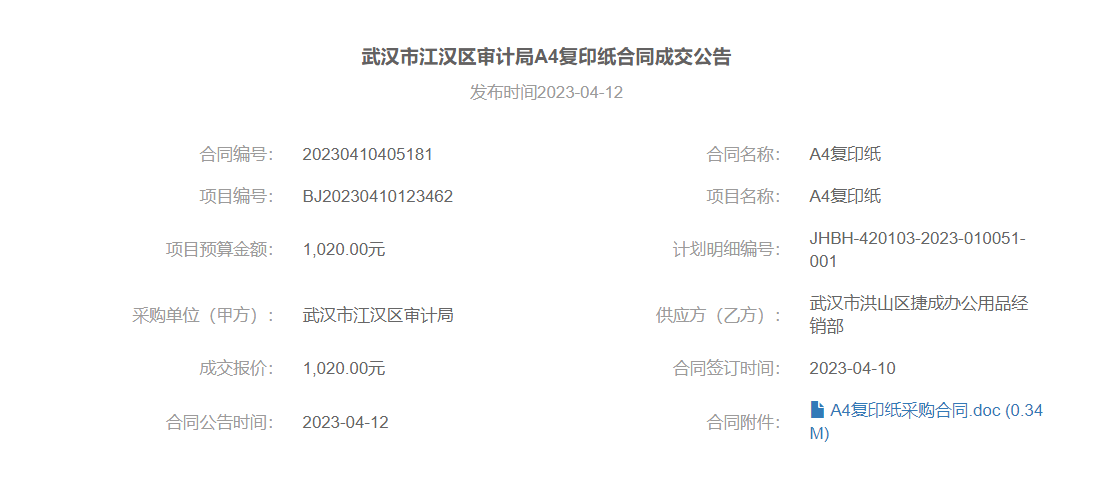 欧亚国际(中国)官方网站 审计局A4复印纸合同成交公告