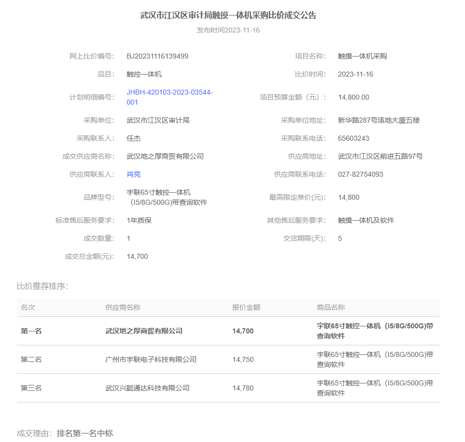 | 标 题 | 欧亚国际(中国)官方网站 审计局触摸一体机采购比价成交公告 | ||