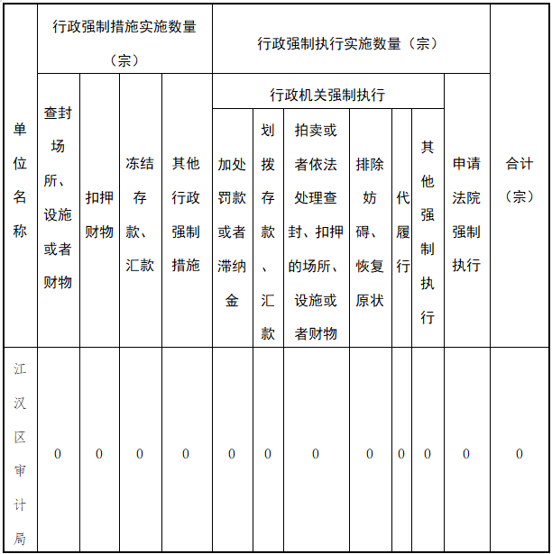说明:1.“行政强制措施实施数量”的统计范围为统计年度1月1日至12月31日期间作出的表格所列各类行政强制措施决定的数量。2.“行政强制执行实施数量”的统计范围为统计年度1月1日至12月31日期间表格所列各类行政强制执行行为执行完毕或者终结执行的数量。3.“申请法院强制执行”数量的统计范围为统计年度1月1日至12月31日期间向法院申请强制执行的数量,时间以申请日期为准。