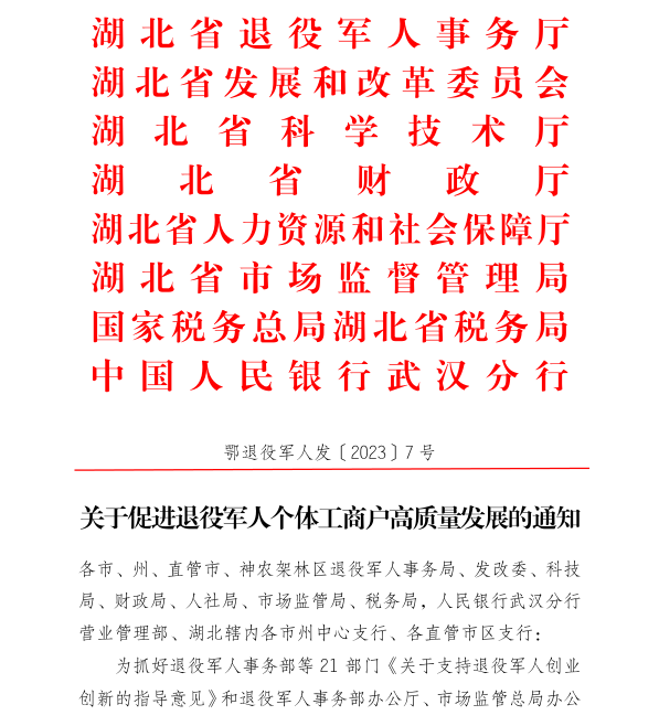 2023年3月21日,湖北省退役军人事务厅、省发展和改革委员会、省科学技术厅、省财政厅、省人力资源和社会保障厅、省市场监督管理局、国家税务总局湖北省税务局、中国人民银行武汉分行印发《关于促进退役军人个体工商户高质量发展的通知》,促进退役军人个体工商户(指在市场监管部门登记且经营者为退役军人的个体工商户)高质量发展,培育壮大退役军人市场主体,带动更多就业。