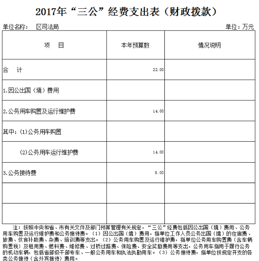 2017年部门财政拨款资金安排“三公”经费预算22万元。具体情况如下: