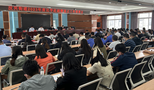 5月8日下午,汉兴街道召开2023年度比学赶超暨重点工作部署会。党工委副书记、办事处主任郭赟通报了2022年度街道绩效管理综合考核结果和一季度绩效目标完成情况。街道区域发展办、公共服务办、公共管理办、党建办4个机关科室重点围绕完成二季度目标任务依次发言。党工委副书记、办事处副主任夏津明传达区消防安全委员会文件精神及铁路护路联防工作会议精神,部署开展消防安全专项排查工作和信访积案化解攻坚行动。