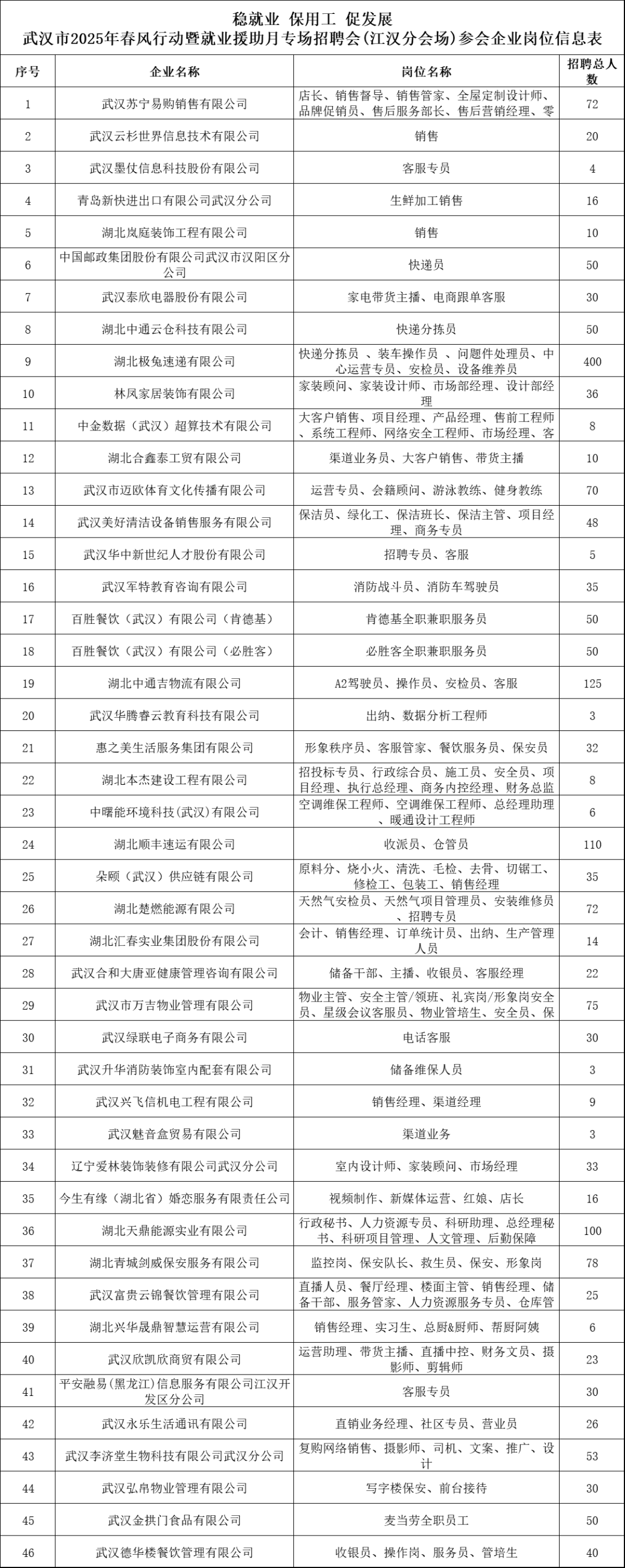 2000个优质岗位,附岗位信息表!武汉市2025年春风行动暨就业援助月专场招聘会(欧亚国际 分会场)即将开启
