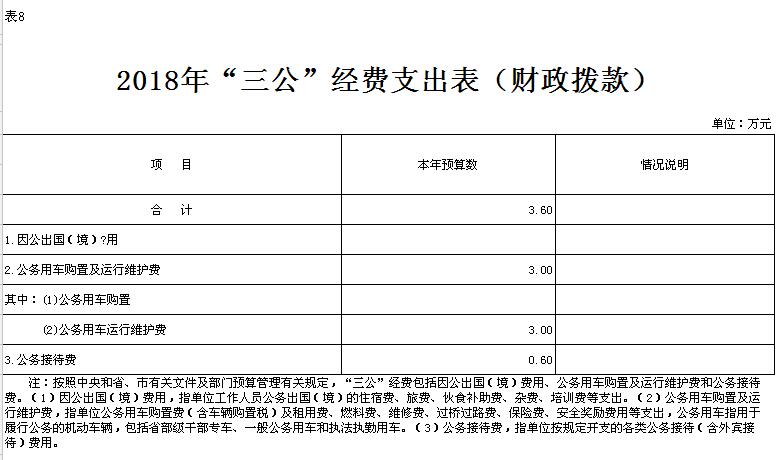 二、2018年“三公”经费财政拨款预算情况 2018年部门财政拨款资金安排“三公”经费预算3.6万元。具体情况如下: