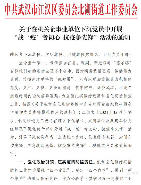 为全面扎实做好近期常态化疫情防控工作,按照《关于在常态化疫情防控中充分发挥党组织战斗堡垒作用和党员先锋模范作用的通知》(江组文〔2021〕35号)要求,北湖街道党工委将在辖区下沉单位、文明单位及共建单位党组织及下沉党员干部中开展“战‘疫’考初心,抗疫争先锋”活动,引导下沉党员争当“忠诚担当先锋、信息排查先锋、封闭守控先锋、应急救助先锋、防疫宣传先锋”。