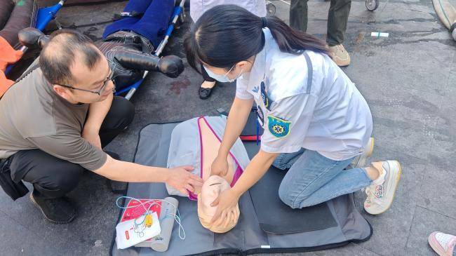 演练现场还进行室外心肺复苏演练,武汉市中心医院救援队的医护人员现场教学,为消防队员和居民详细讲解体外除颤仪(AED)的操作步骤和注意事项,并邀请现场商户和居民参与实践。通过模拟心脏骤停的情景,医护人员指导大家如何进行有效的心肺复苏,为挽救生命赢得宝贵时间。