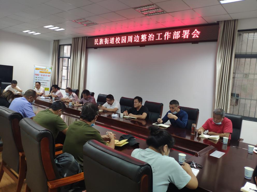 为提高街道对校园安全工作预防和控制突发疫情事件的能力和水平,减轻或消除突发事件的危害,维护学校正常的教学秩序和校园稳定,2021年8月27日下午,街道组织派出所、工商所、城管等多个部门在政务中心三楼召开民族街道校园周边整治工作部署会,会上公共安全办主任宋志强指导辖区内消防安全工作,街工委会副书记兼副主任姚峻和街政法委副主任徐邦耀重点指导校园周边整治工作,要求对校园内的环境消杀、消防、线路检修及安防设施进行督查,并对发现的问题提出整改要求,强调必须要做好学校上、下学时段学生安全问题,防范社会危害人群对学生的袭扰。