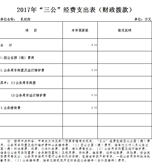 2017年部门财政拨款资金安排“三公”经费预算5万元。具体情况如下: