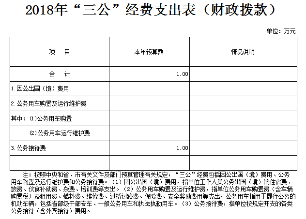 2018年部门财政拨款资金安排“三公”经费预算1万元。具体情况如下: