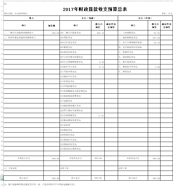 2017年部门预算总支出389.06万元。较2016年年初预算减少33.58万元,减少7.95%。其中:财政拨款(补助)支出389.06万元。