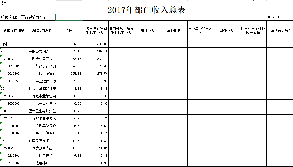 2017年部门预算总收入389.06万元。较2016年年初预算减少33.58万元,减少7.95%。其中:财政拨款(补助)收入389.06万元。