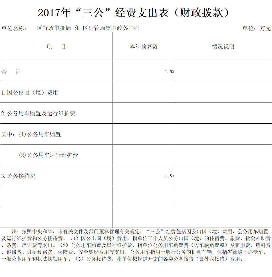 2017年部门财政拨款资金安排“三公”经费预算1.5万元。具体情况如下: