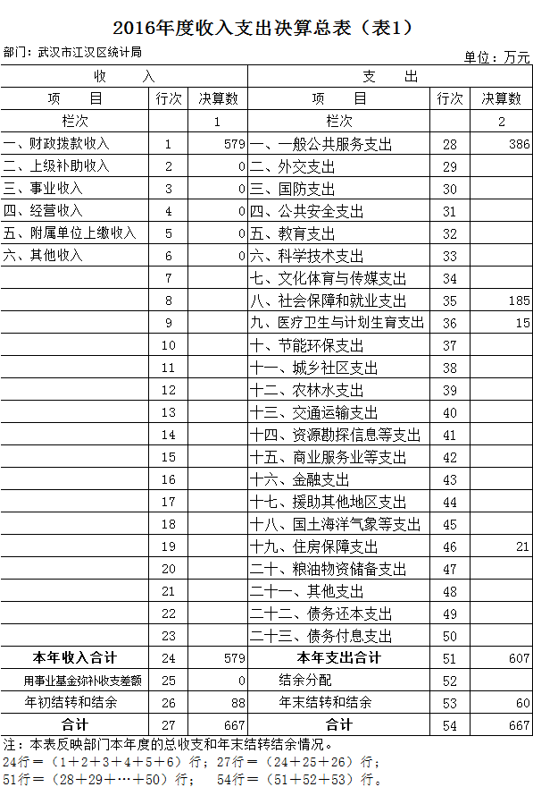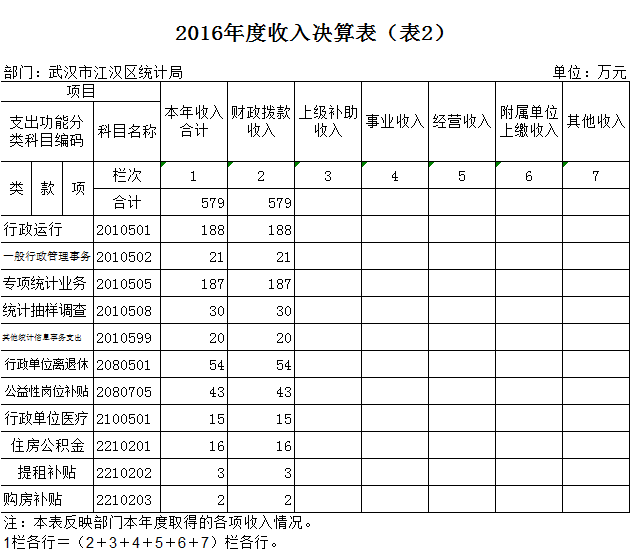 2016年度收入总计 579 万元,支出总计 607万元。与2015年相比,收入增加73万元 ,增长14.43%,主要原因是2016年新增10名统计协理员和3名统计调查员。支出增加124万元,增长25.67%,主要原因是新增10名统计协理员和3名统计调查员。