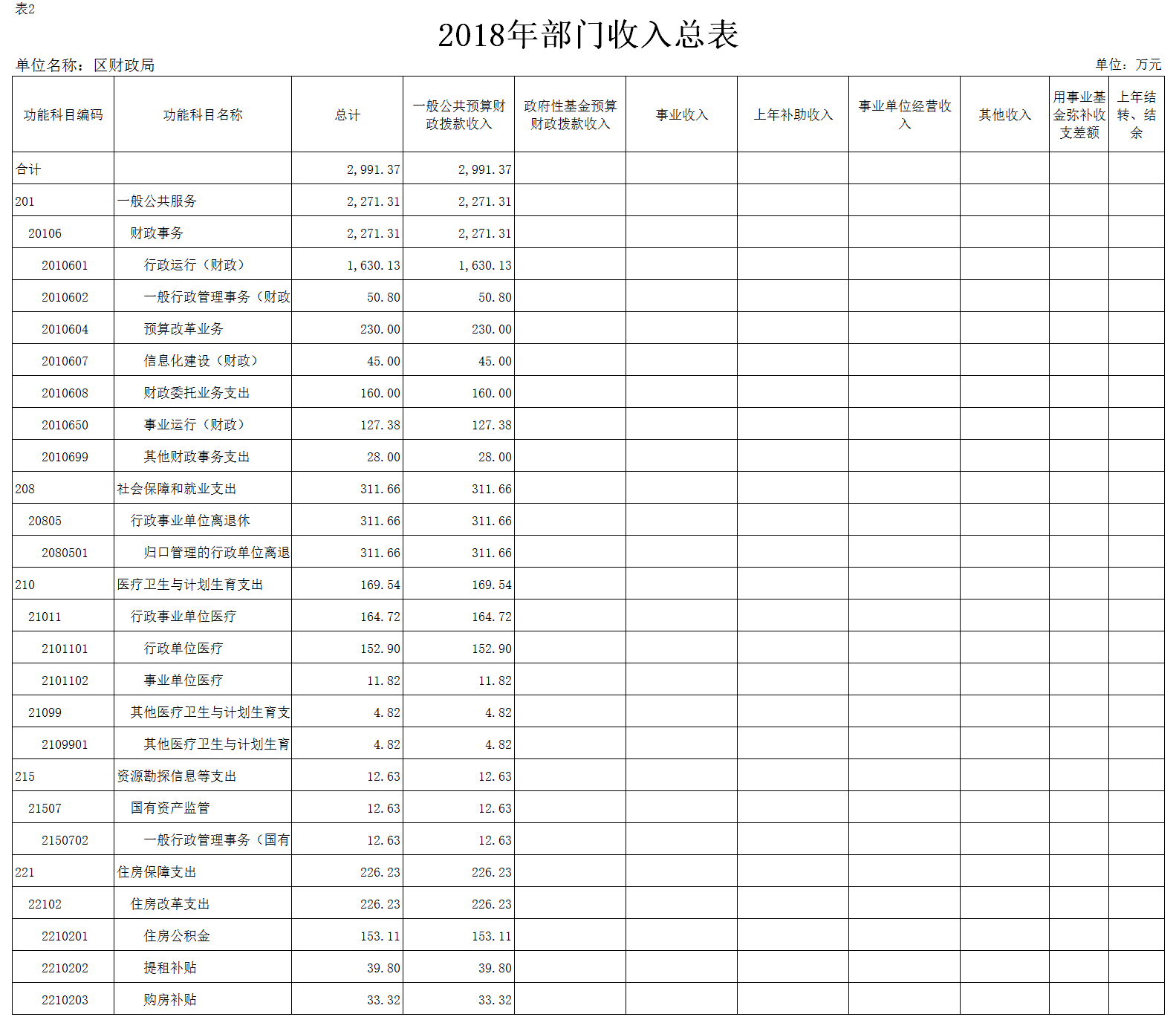 2018年部门预算总收入2,991.37万元,较2017年年初预算增加299.9万元,增长11.14%。其中:一般公共预算财政拨款(补助)收入2,991.37万元。