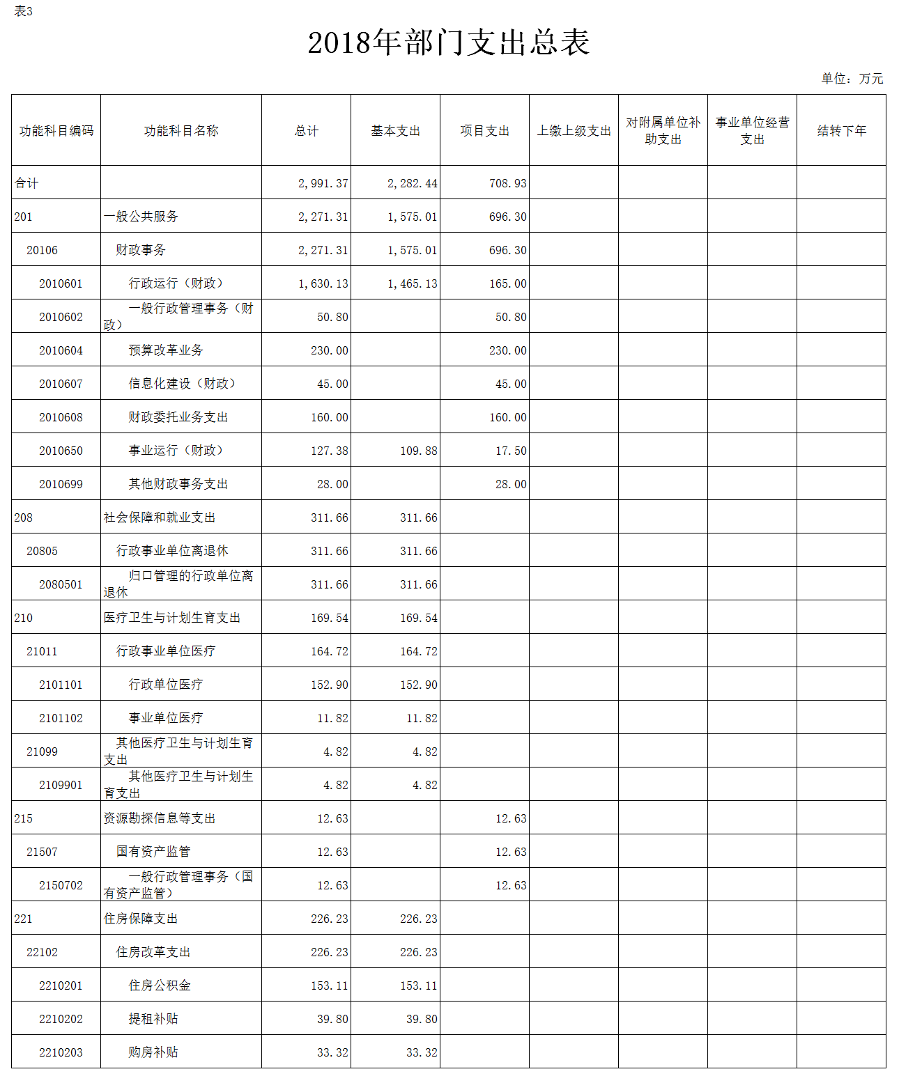 2018年部门预算总支出2,991.37万元,较2017年年初预算增加299.9万元,增长11.14%。其中:一般公共预算财政拨款(补助)支出2,991.37万元,主要用于基本支出2,282.44万元,项目支出708.93万元。
