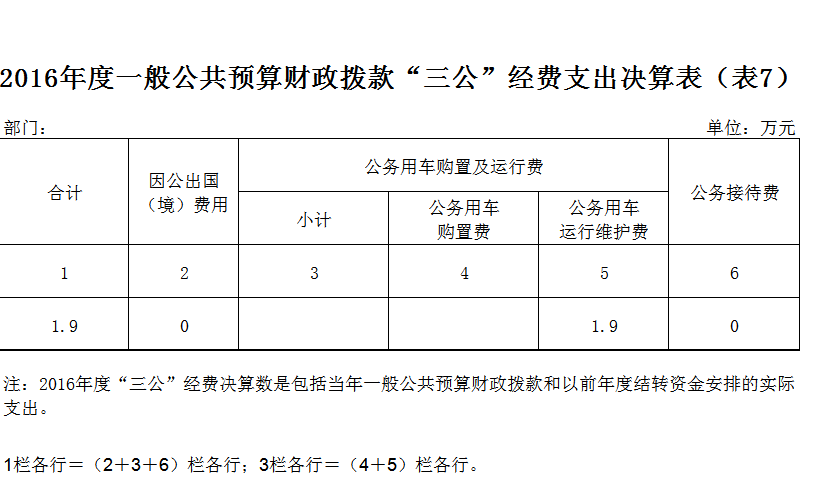 2016年度"三公"经费财政拨款年度预算为2万元,支出决算为1.9万元,完成预算的95%。其中: