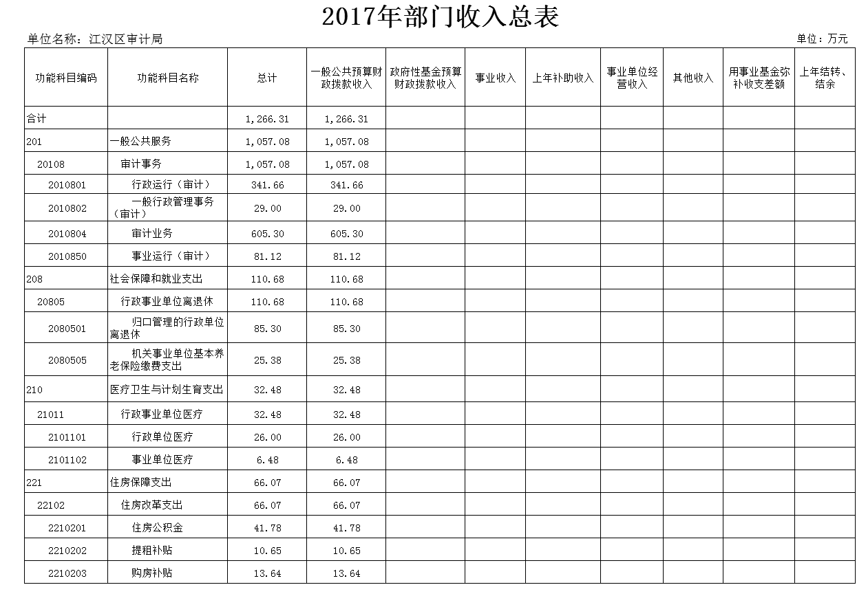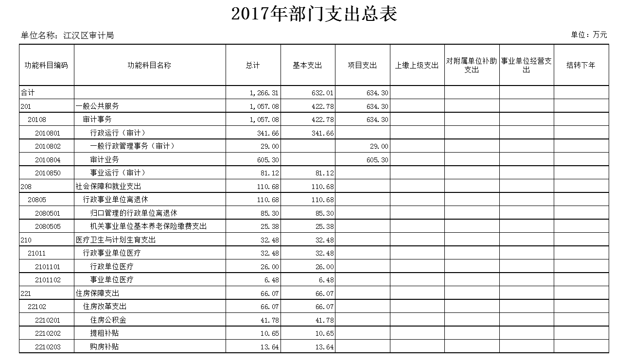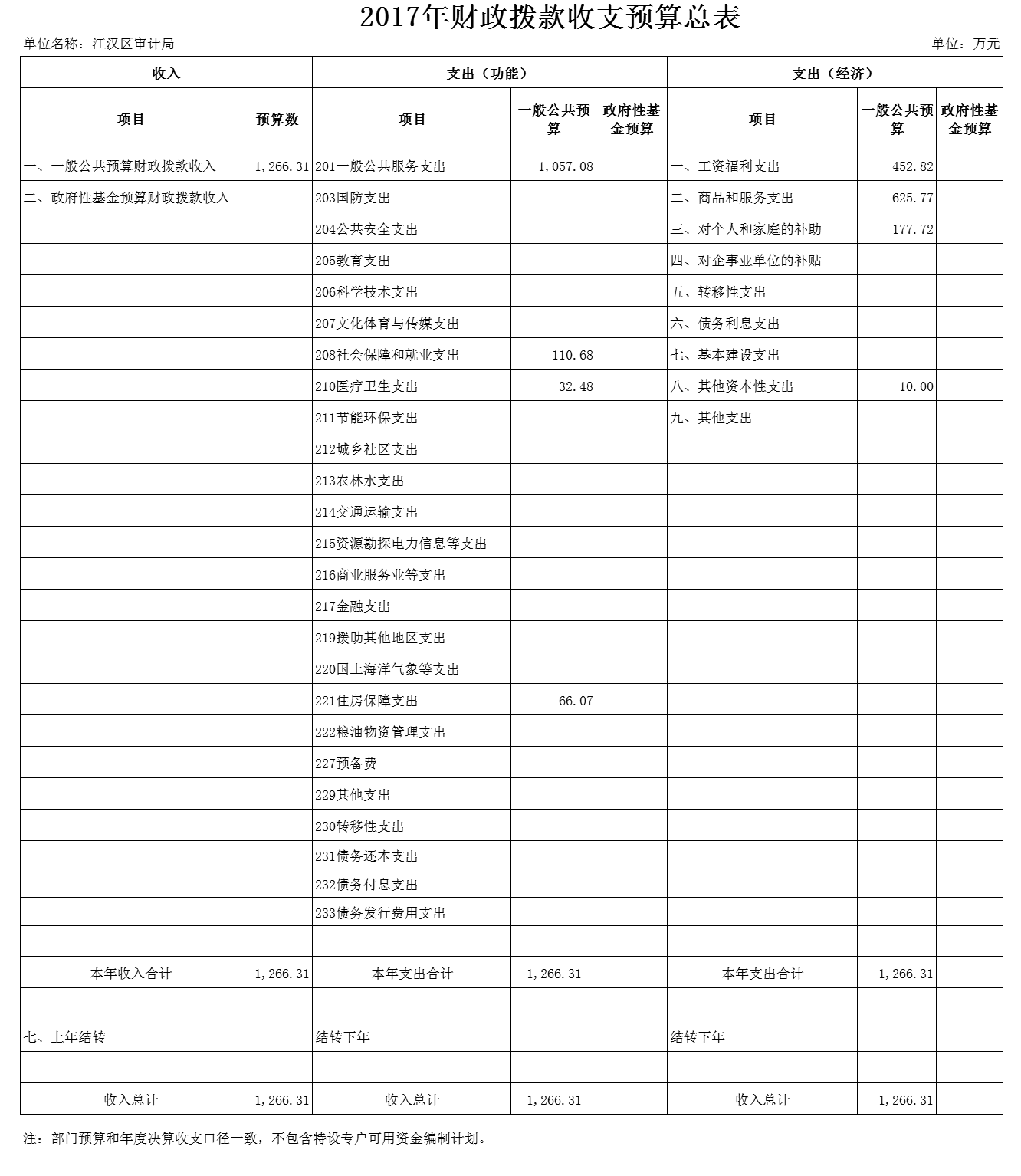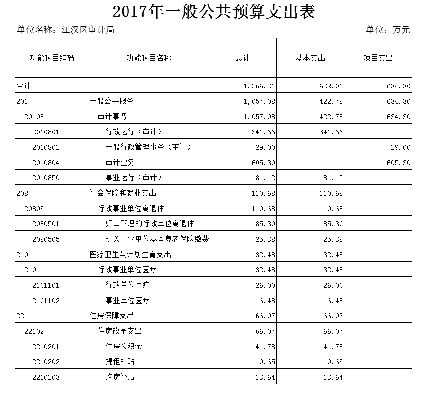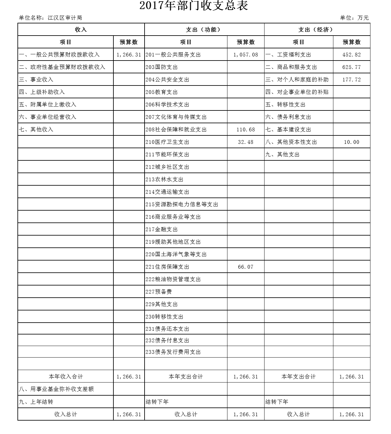 审计局共有编制22人,其中:行政编制14人,事业编制7人。在职实有人数22人,其中:行政16人,事业6人(其中参照公务员法管理0人)。离退休人员10人,其中:离休10人,退休10人。 编制小计 行政编制 事业编制 实有人数小计 行政人数 事业人数 其中:参公人数 离退休人员 离休人员 退休人员 21 14 7 22 16 6 10 10 二、2017年收支预算情况 2017年部门预算总收入1266.31万元。其中:财政拨款(补助)收入1266.31万元,事业收入0万元,上级补助收入0万元,附属单位上缴收收入0万元,事业单位经营收入0万元,其他收入0万元,上年结转0万元。 较2016年年初预算增加526.89万元,增长41.61%。 2017年部门预算总支出1266.31万元。其中:财政拨款(补助)支出1266.31万元,主要用于:基本支出632.01万元;项目支出634.3万元。 较2016年年初预算增加526.89万元,增长41.61%,主要是政府购买审计服务和聘用专业技术人员经费支出增加。 三、2017年财政拨款(补助)预算安排情况说明 2017年财政拨款(补助)预算数1266.31万元,安排情况如下: (一)基本支出632.01万元。主要用于: 1.工资福利支出347.32万元。 2.对个人和家庭的补助177.72万元。 3.商品和服务支出106.97万元。 (二)项目支出634.3万元。主要用于: 一般公共服务支出634.3万元。其中安排的主要项目有: (1)档案管理项目10万元。 (2)党建,结对共建及文明创建项目6万元。 (3)法律顾问经费项目3万元。 (4)固投工作经费项目105.5万元。 (5)金审工程设备更新项目10万元。 (6)领导干部经济责任审计项目26.2万元。 (7)培训费项目19万元。 (8)上级审计机关交办审计项目23.8万元。 (9)审计外勤工作经费项目19.8万元。 (10)审计业务建设经费项目11万元。 (11)网络维护费18万元。 (12)中介机构外聘费项目382万元。 四、其他重要事项的情况说明 (一)机关运行经费情况 2017年部门机关运行经费106.97万元。主要包括:办公费、印刷费、水电费、邮电费、差旅费、会议费、福利费、日常维修费、办公用房物业管理费、公务用车运行维护费及其他费用等。 (二)政府采购预算情况 按照现行政府采购管理规定,2017年部门预算中纳入政府采购预算支出合计38万元。包括:物类10万元,服务类 23 万元,工程类5万元。 (三)国有资产占有使用情况 无国有资产占用情况 (四)绩效目标设置情况 2017年部门项目、公共项目均实行绩效目标管理,涉及一般公共预算当年财政拨款 634.3万元。 名词解释 (一)财政拨款收入:指本级财政当年拨付的资金。 (二)事业收入:指事业单位开展专业业务活动及其辅助活动取得的收入。 (三)经营收入:指事业单位在专业业务活动及其辅助活动之外开展非独立核算经营活动取得的收入。 (四)其他收入:指除“财政拨款收入”、“事业收入”、“经营收入”等以外的收入,包括银行存款利息收入、租金收入、捐赠收入,现金盘盈收入、存货盘盈收入、收回已核销应收及预付款项、无法偿付的应付及预收款项等。 (五)机关运行经费:行政单位和参照公务员法管理的事业单位为保障单位运行使用一般公共预算财政拨款安排的基本支出中的日常公用经费支出。包括办公及印刷费、邮电费、差旅费、会议费、福利费、日常维修费、专用材料及一般设备购置费、办公用房水电费、办公用房取暖费、办公用房物业管理费、公务用车运行维护费以及其他费用。 (六)政府性基金预算:国家通过向社会征收以及出让土地、发行彩票等方式取得收入,并专项用于支持特定基础设施建设和社会事业发展的财政收支预算,是政府预算体系的重要组成部分。 2017年“三公”经费财政拨款预算情况说明 一、“三公”经费的单位范围 欧亚国际(中国)官方网站
