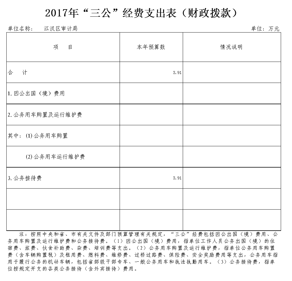 审批后列入单位预算,年终并入单位决算予以公开。 (二)公务接待费 公务接待费3.91万元,比上年预算持平。主要用于:审计业务工作招待 (三)公务用车购置及运行维护费 1、公务用车购置费。 本年无购车支出。 车辆运行维护费支出0万元。