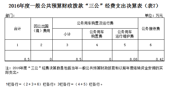 (四)“三公”经费:指使用一般公共预算财政拨款安排的因公出国(境)费、公务用车购置及运行维护费和公务接待费。其中,因公出国(境)费用反映单位公务出国(境)的国际旅费、国外城市间交通费、住宿费、伙食费、培训费、公杂费等支出;公务用车购置及运行维护费反映单位公务用车车辆购置支出(含车辆购置税)及租用费、燃料费、维修费、过桥过路费、保险费、安全奖励费用等支出;公务接待费反映单位按规定开支的各类公务接待(含外宾接待)费用。