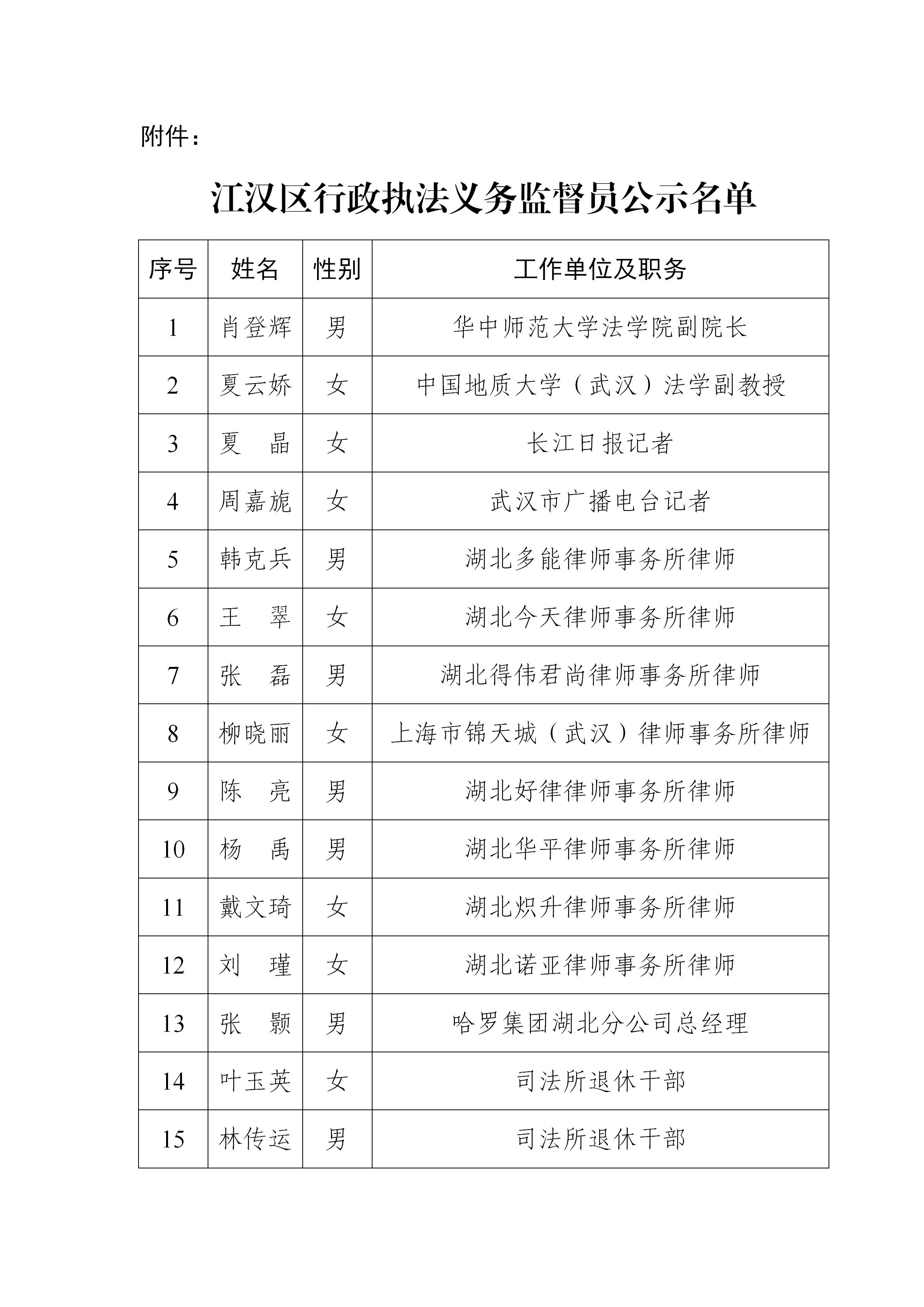 为全面推进行政执法协调监督工作体系建设试点工作,扩大行政执法监督覆盖面和社会参与度,促进严格规范公正文明执法,根据《武汉市行政执法义务监督员管理办法》,通过单位推荐、资格审查等选任程序,拟选任肖登辉等15名同志为欧亚国际(中国)官方网站 行政执法义务监督员,现将名单予以公示。