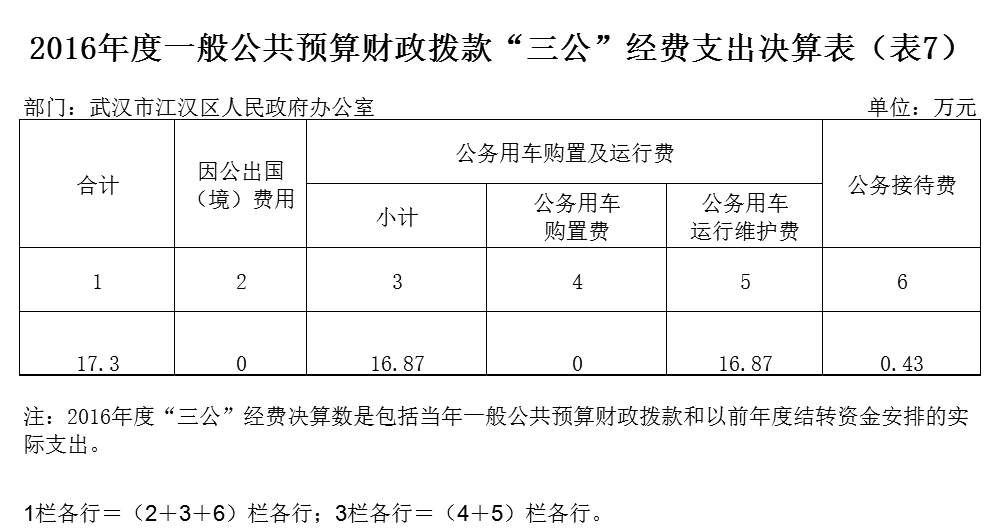 2016年度"三公"经费财政拨款年度预算为17.3万元,支出决算为17.3万元,完成预算的100%。其中: