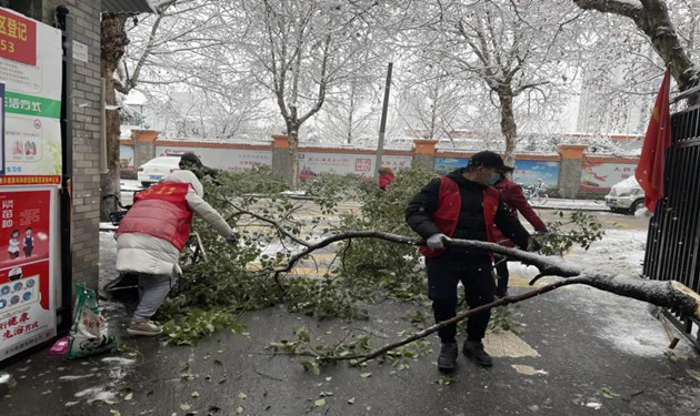新华家园社区党委书记带队到辖区内重点路段、重点区域进行巡查,组织力量对被大雪压倒压断的树枝进行清理,对小区人行道、上下坡道路进行清扫和撒盐除雪作业,为社区居民清扫出一条条爱心防滑路。