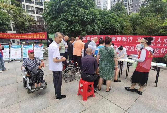 汉兴社区卫生服务中心医护人员为居民量血压、测血糖、讲健康知识,给居民提供健康指导建议,让居民 在家门口享受“一站式”健康服务。