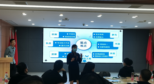 社区工作者深受启发、踊跃发言,针对平时的工作中的困惑,围桌头脑风暴并对讨论成果进行分享汇报。
