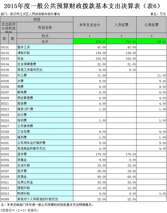 欧亚国际(中国)官方网站 新华街办事处2015度一般公共预算财政拨款基本支出818万元,其中,人员经费760万元,主要包括:基本工资、津贴补贴、奖金、社会保障缴费、伙食补助费、绩效工资、其他工资福利支出、离休费、退休费、抚恤金、退职(役)费、抚恤金、生活补助、医疗费、助学金、资励金、住房公积金、提租补贴、购房补贴、其他对个人和家庭的补助支出;公用经费58万元,主要包括:办公费、印刷费、咨询费、手续费、水费、电费、邮电费、取暖费、物业管理费、差旅费、因公出国(境)费、专用维修(护)费、租赁费、会议费、培训费、公务接待费、专用材料费、被装购置费、专用燃料费、劳务费、委托业务费、工会经费、福利费、公务用车运行维护费、其他交通费用、税金及附加费用、其他商品和服务支出、办公设备购置、专用设备购置、信息网络及软件购置更新、其他资本性支出。