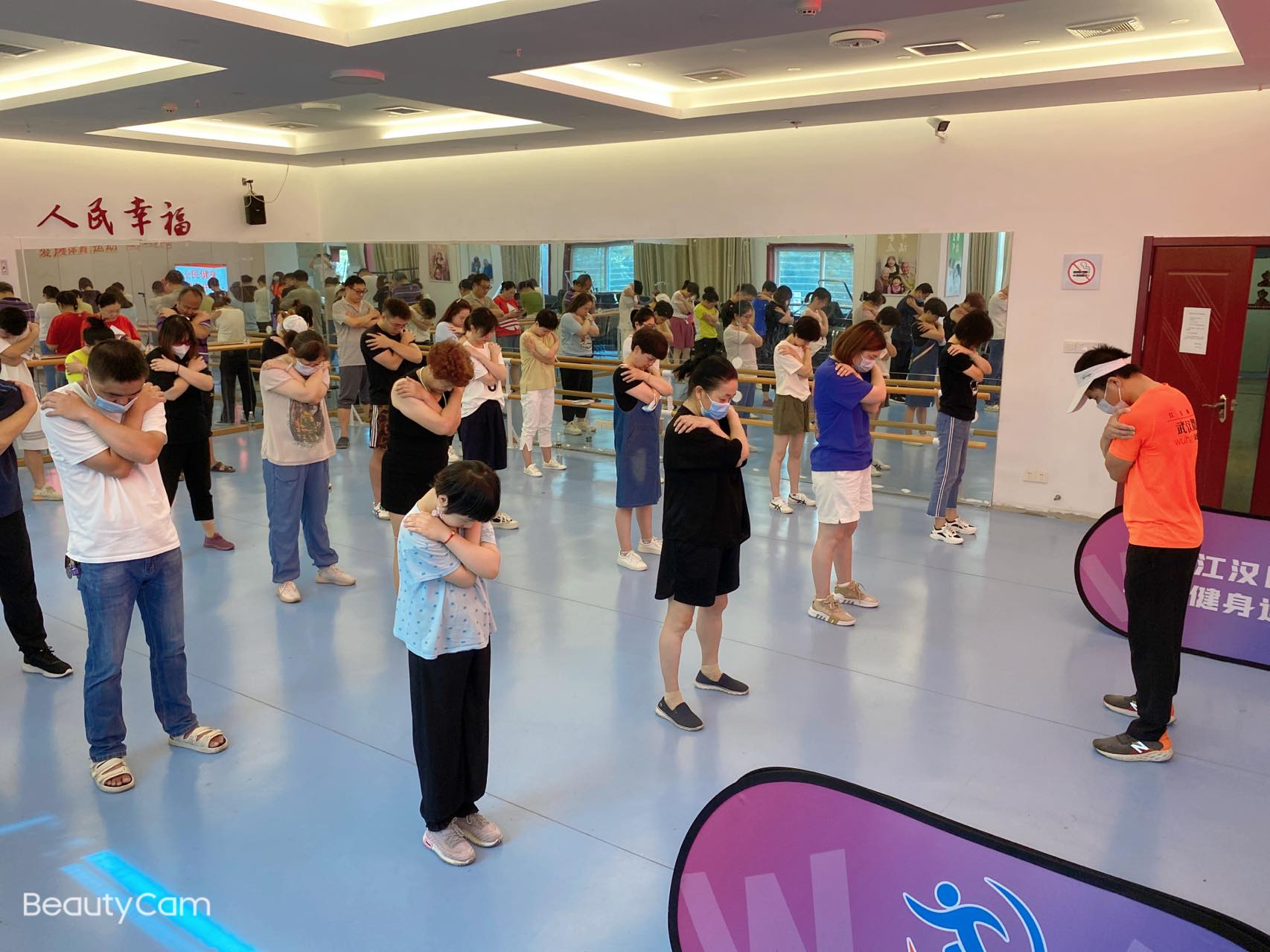 活动开始前,老师带着大家做运动热身,并叮嘱大家夏季运动前的注意事项。接着,讲解了动作基本要领,通过颈部缓解、肩部热身、胸部激活、活动手腕、下腰转体,膝节活动,转动脚裸,弓步压腿等八个重要环节,边学边练,帮助大家快速准确掌握动作要领。大家一手一足认真跟着老师学习每一个动作,不一会儿功夫,大伙儿就汗流浃背,身心压力很快得到了舒缓,心情也变得愉悦起来。
