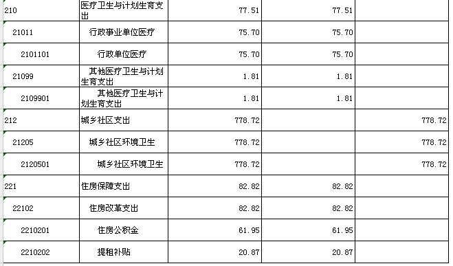 一般公共服务支出1851.39万元;社会保障和就业655.26万元;医疗卫生与计划生育支出77.51万元;城乡社区事务778.72万元;住房保障支出82.82万元。