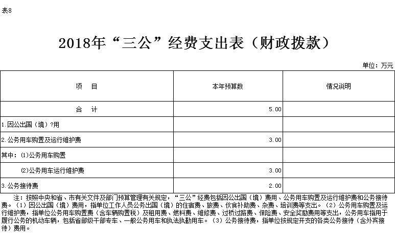 2018年部门财政拨款资金安排“三公”经费预算 5万元。具体情况如下: