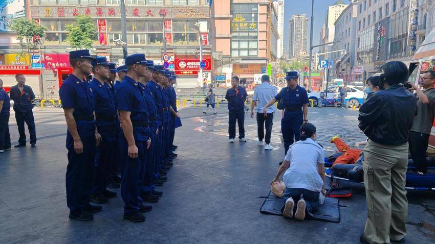 演练现场还进行室外心肺复苏演练,武汉市中心医院救援队的医护人员现场教学,为消防队员和居民详细讲解体外除颤仪(AED)的操作步骤和注意事项,并邀请现场商户和居民参与实践。通过模拟心脏骤停的情景,医护人员指导大家如何进行有效的心肺复苏,为挽救生命赢得宝贵时间。