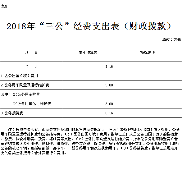 2018年部门财政拨款资金安排“三公”经费预算3.16万元。具体情况如下: