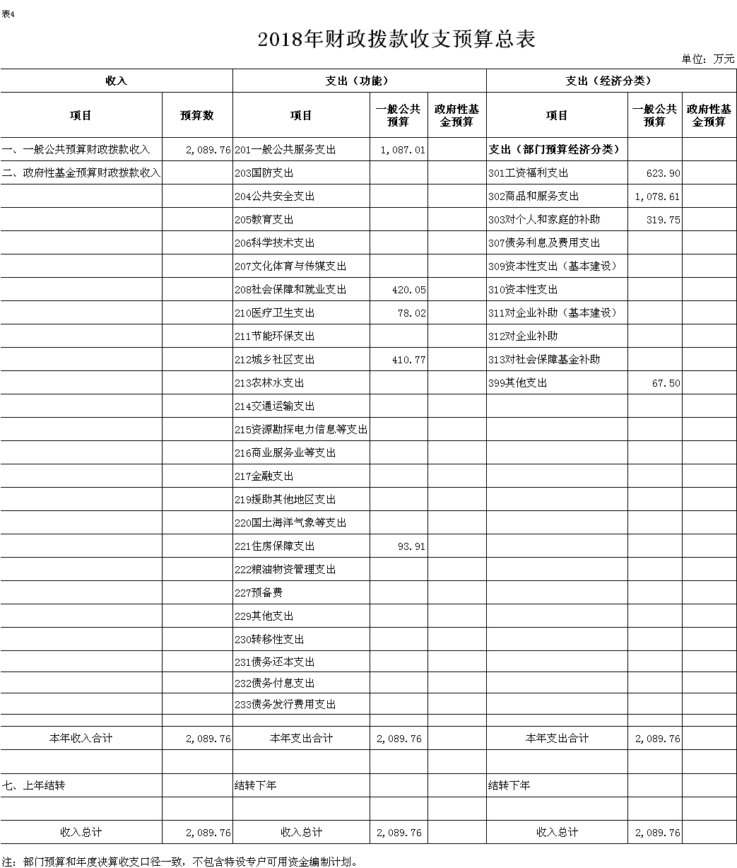 2018年一般公共预算财政拨款(补助)预算数2089.76万元,安排情况如下: