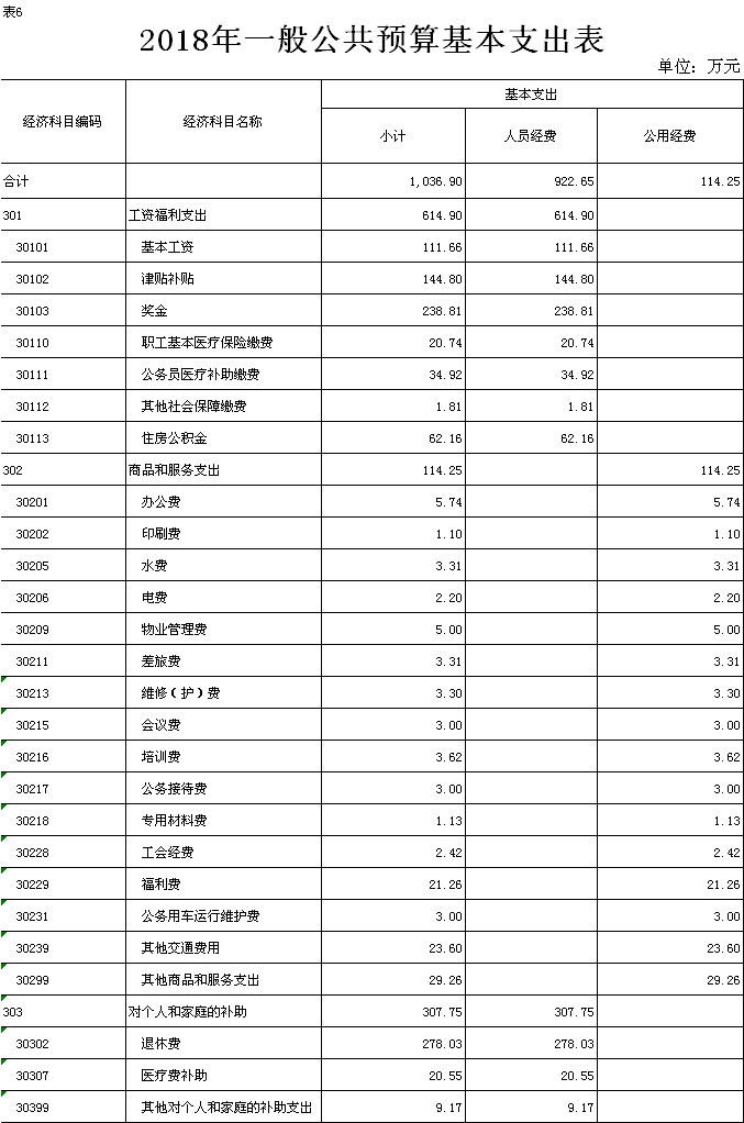 (一)基本支出1036.90万元,较2017年年初预算增加114.53万元,增长12.42%。主要用于: