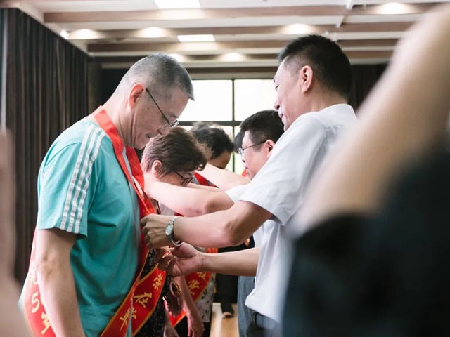 颁发仪式上,老党员们纷纷走上舞台中央,由街党工委领导们为其颁发纪念章,并接受大家热烈的掌声和祝贺。紧接着,大兴路小学的学生们为光荣的老党员们献上庆祝的鲜花。胸戴闪光奖章,手捧芬芳鲜花,幸福和快乐洋溢整场。
