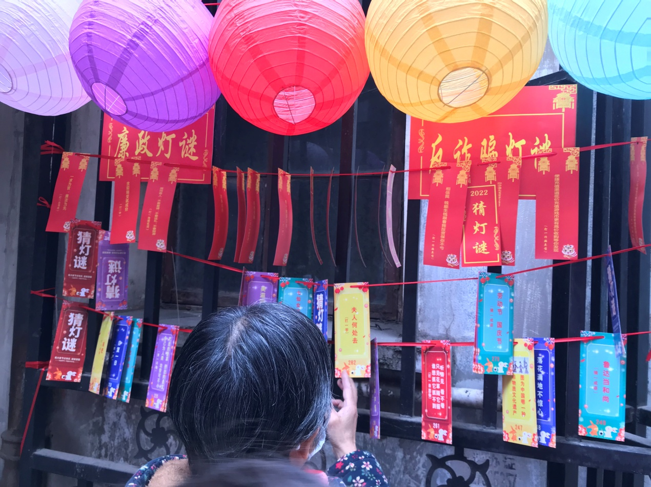 造型各异的灯笼简化为图案多彩的灯谜卡片,配合红线,彩纸花灯,将巷内积尘铁门装饰成琳琅缤纷的“上元彩门”,虽是白日,也颇有“人踏春阳,灯火辉煌”之意。