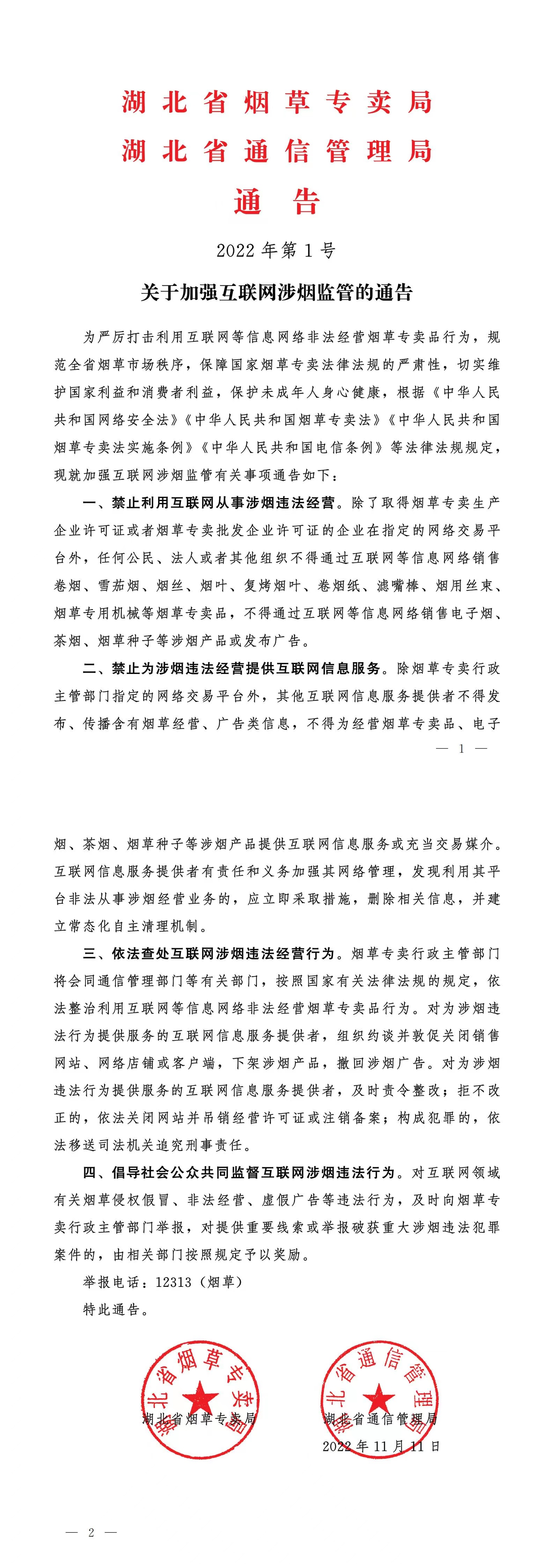 | 标 题 | 湖北省烟草专卖局 湖北省通信管理局 通 告 2022年第1号 关于加强互联网涉烟监管的通告 | ||