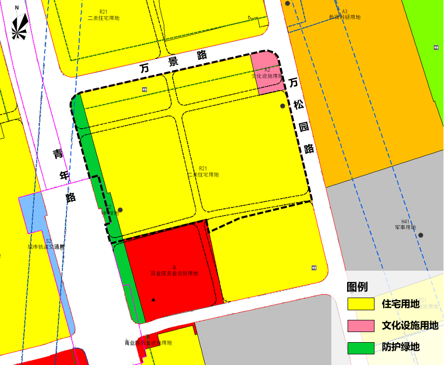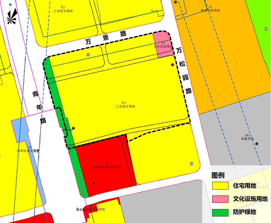 四至范围:东至万松园路,南至规划公共通道,西至青年路,北至规划道路(万景路)。