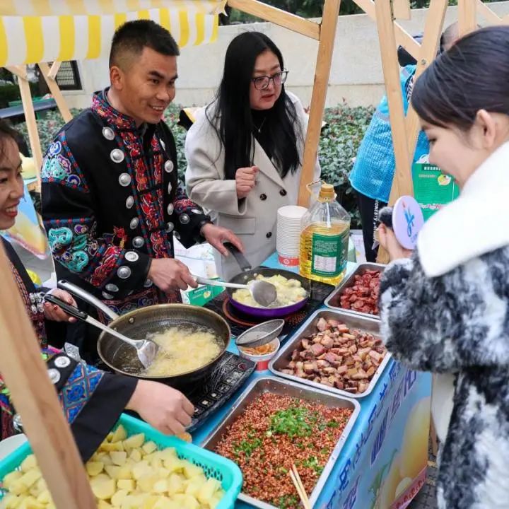 在现场的摊位上,用柚子皮制成的柚子鸡、柚子熊造型奇特,吸引了不少居民前来围观。天气寒冷,现场还为居民准备了热乎乎的柚子茶,腊猪蹄、腊排骨、小土豆在油锅里翻腾,空气中都是特色美食的香味。宣恩柚乡苑社区的工作人员热情地招呼着居民前来试吃。